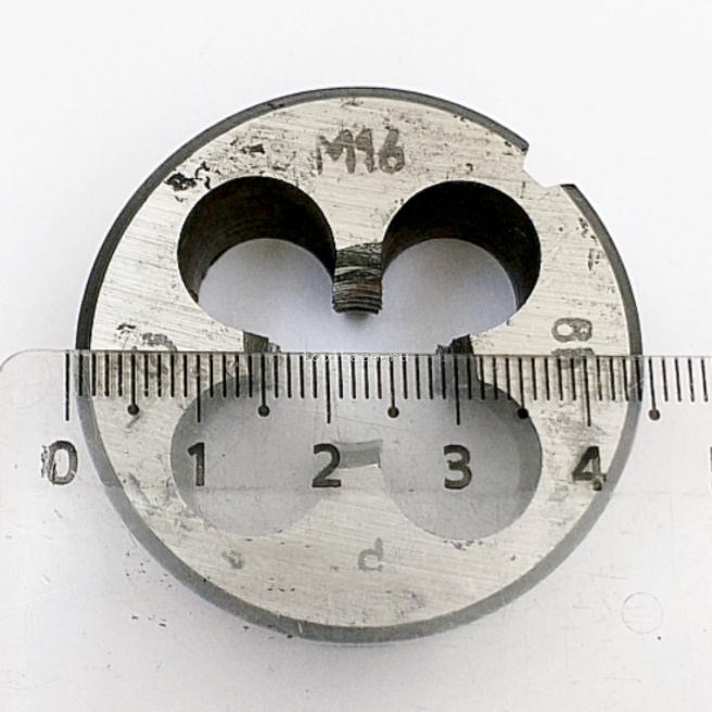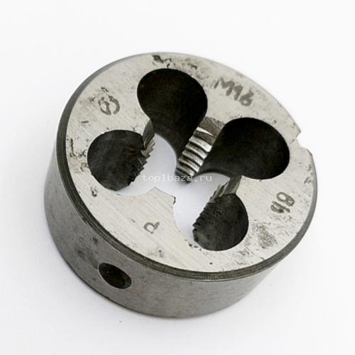 Описание товара: Тип резьбы- метрическая (М) d-16мм, D-45мм, L-18мм. Вид шага- основной. Количество стружечных канавок- 4шт. Материал плашки- 9ХС.
